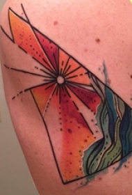 女生手臂上黑色线条几何元素三角形彩绘海边风景纹身图片