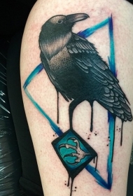 大腿黑色乌鸦与神秘的蓝色三角纹身图案