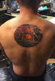 纹身后背女 女生后背上彩色的三角形纹身图片