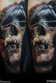 大臂日式卡通魔鬼面具与红三角纹身图案