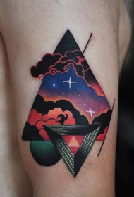 小臂彩色神秘狼与红三角和蝴蝶眼睛纹身图案