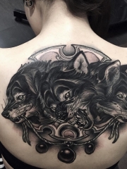 女生背部黑灰欧美三头犬纹身图案