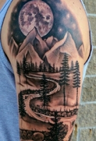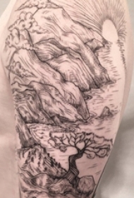 手臂纹身图片 男生手臂上黑色的山水风景纹身图片