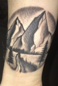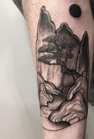 小腿上黑白灰风格几何元素点刺技巧山水纹身风景图片