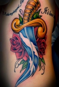 女生脖子schoo黄色玫瑰和匕首纹身图案