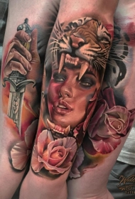 部落女子与老虎头盔玫瑰和匕首彩色手臂纹身图案