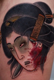 手臂亚洲风格的五彩血腥艺妓匕首纹身图案