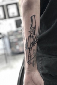 纹身黑色 男生手臂上植物和匕首纹身图片