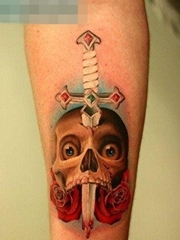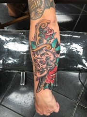 男性手臂传统彩色纹身玫瑰花和骷髅头匕首纹身图片
