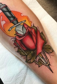 手臂纹身图案女生 女生手臂上玫瑰和匕首纹身图片