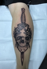 小腿对称纹身 男生小腿上匕首和骷髅纹身图片