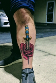 欧美小腿纹身 男生小腿上彩色的匕首纹身图片