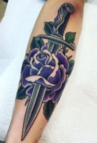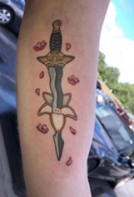 男生手臂上黑色点刺简单线条匕首和花朵纹身图片