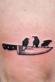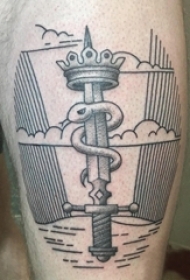 男生大腿上黑灰点刺几何简单线条匕首纹身图片