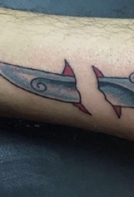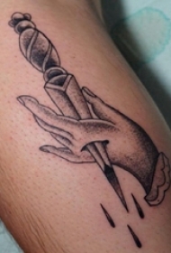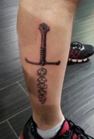 男生小腿上黑色点刺简单线条手和匕首纹身图片
