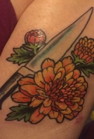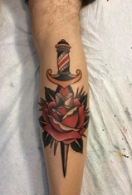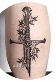 男生小腿上彩绘简单线条植物花朵和匕首纹身图片