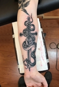男生手臂上黑灰素描点刺技巧创意蛇图腾匕首纹身图片