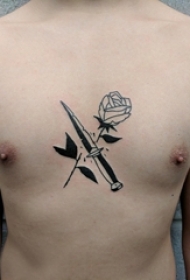 男生胸部黑色简单线条创意花朵和匕首纹身图片