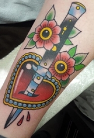 男生手臂上彩绘水彩素描创意心形霸气匕首纹身图片