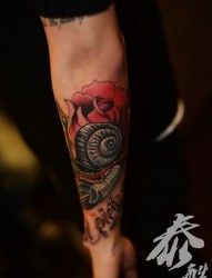 男生胳膊个性蜗牛玫瑰花纹身图片