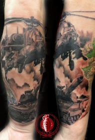 黑灰军事直升机和坦克手臂纹身图案