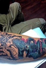 插画风格的黑色线条吸烟狐狸手臂纹身图案