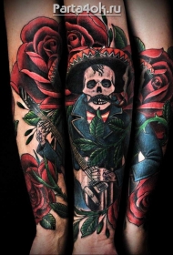 插画风格彩色墨西哥音乐家与帽子和玫瑰手臂纹身图案