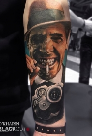 漂亮的彩色手枪和吸烟男性肖像手臂纹身图案