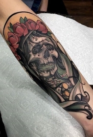 现代风格的彩色骷髅与玫瑰手臂纹身图案