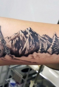 手臂个性写实的山脉黑灰纹身图案