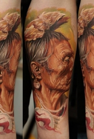 写实风格的印第安老人肖像彩色手臂纹身图案
