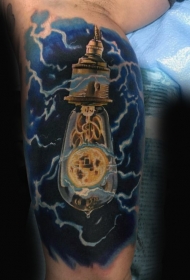 经典的彩色写实灯泡和闪电手臂纹身图案