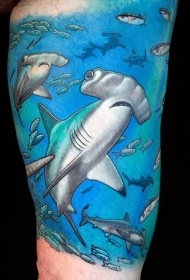 手臂彩色的各种鲨鱼和鱼类纹身图案