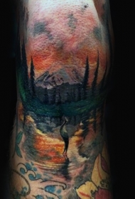 手臂彩色的山林风景纹身图案