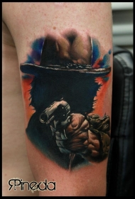 华丽的彩色神秘牛仔与手枪手臂纹身图案