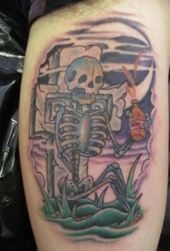 old school彩色喝饮料的骷髅与墓碑纹身图案