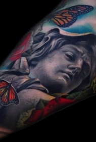 彩色的蝴蝶和花朵雕像手臂纹身图案