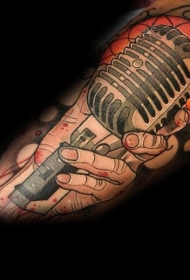 手臂非常逼真的彩色复古麦克风与手纹身图案