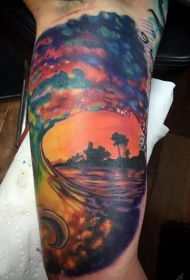 手臂壮丽的七彩浪花纹身图案