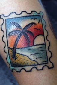 手臂非常写实的黑白海岸与棕榈树纹身图案
