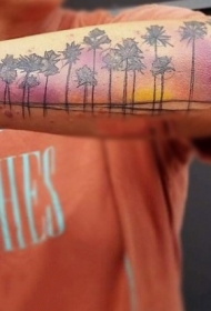 手臂彩色海滩与一排棕榈树纹身图案