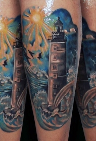 巨大的五彩灯塔与海浪手臂纹身图案