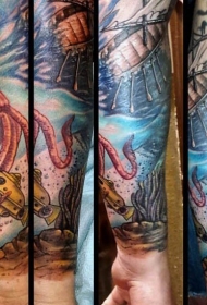 手臂华丽的彩色航海主题鱿鱼和船舶纹身图案