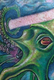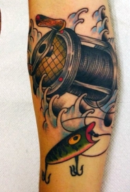 手臂彩色的钓鱼线圈与鱼纹身图案