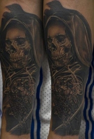 逼真的黑色骷髅与乌鸦手臂纹身图案