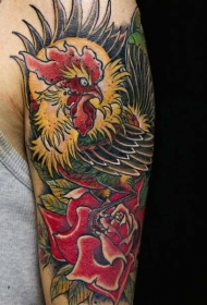 有趣的彩色大公鸡与玫瑰手臂纹身图案