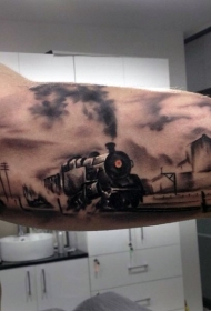 手臂精确设计的黑白中世纪城堡与骷髅纹身图案