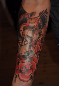 old school手臂彩色沙漏与花朵翅膀纹身图案