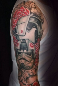 大臂红色的牡丹花和蓝色波浪纹身图案