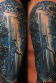 手臂粉红色卷曲的羽毛和字母纹身图案